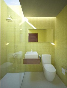 Piso y muros con revestimiento tipo mosaico, iluminación cenital en cenefa y cielo, lucarna sobre ducha, puertas vidriadas en ducha, mueble lavamanos, espejo.
